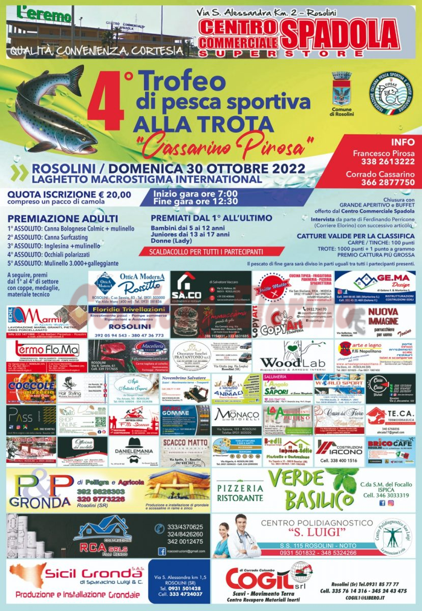 Si scaldano i mulinelli a Rosolini per la quarta edizione del trofeo di Pesca Sportiva alla Trota organizzata dai giovani Corrado Cassarino e Francesco Pirosa con il patrocinio del Comune di Rosolini e della Federazione Italiana Pesca Sportiva e Attività Subacquee.