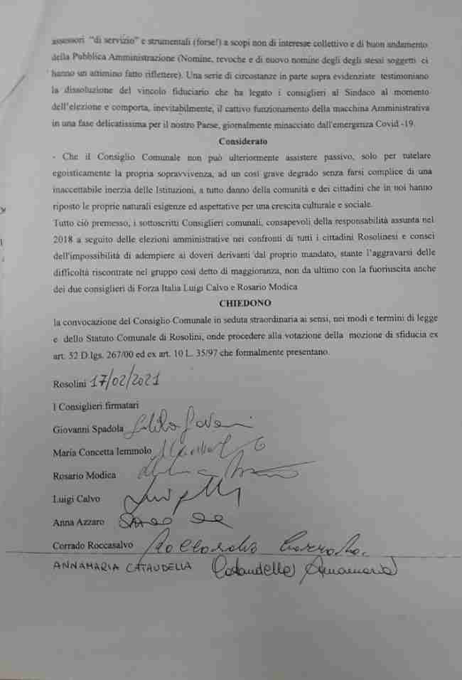 Tutte questioni che testimoniano “la dissoluzione – si legge ancora- del vincolo fiduciario che ha legato i consiglieri al sindaco al momento dell’elezione e comporta il cattivo funzionamento della macchina amministrativa in un momento delicato in cui anche il nostro paese è minacciato dall’emergenza Covid 19“.