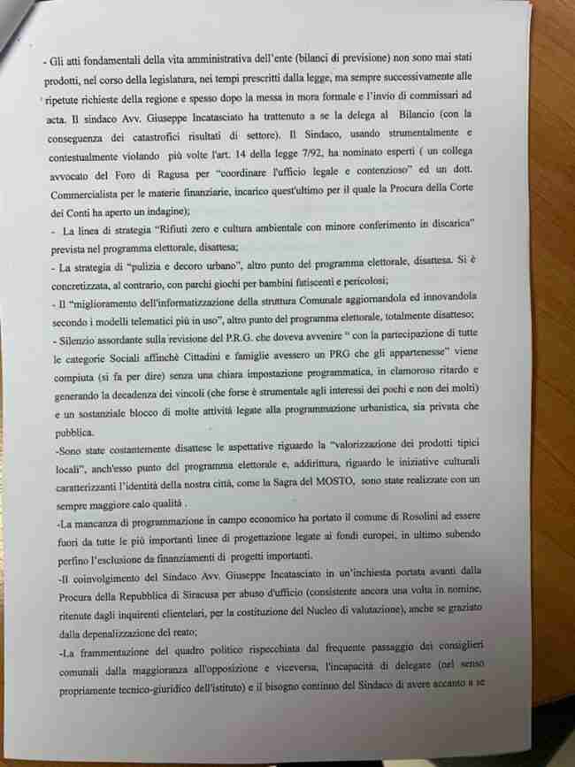 “L’operato del sindaco, dall’inizio del mandato ad oggi, si è caratterizzato per gravi inadempienze ai più elementari dettami di correttezza e buona gestione politico amministrativa”– si legge nell’incipit del documento in cui i consiglieri elencano, tra le inadempienze, bilanci di previsioni prodotti oltre i tempi previsti per legge, il fallimento delle strategie rifiuti zero, cultura ambientale, decoro urbano e valorizzazione dei prodotti tipici previsti nel programma elettorale di Incatasciato, il “silenzio assordante” sulla revisione del Prg, il coinvolgimento del sindaco nell’inchiesta Nucleo di Valutazione, “anche se poi graziato – scrivono – dal reato depenalizzato“.