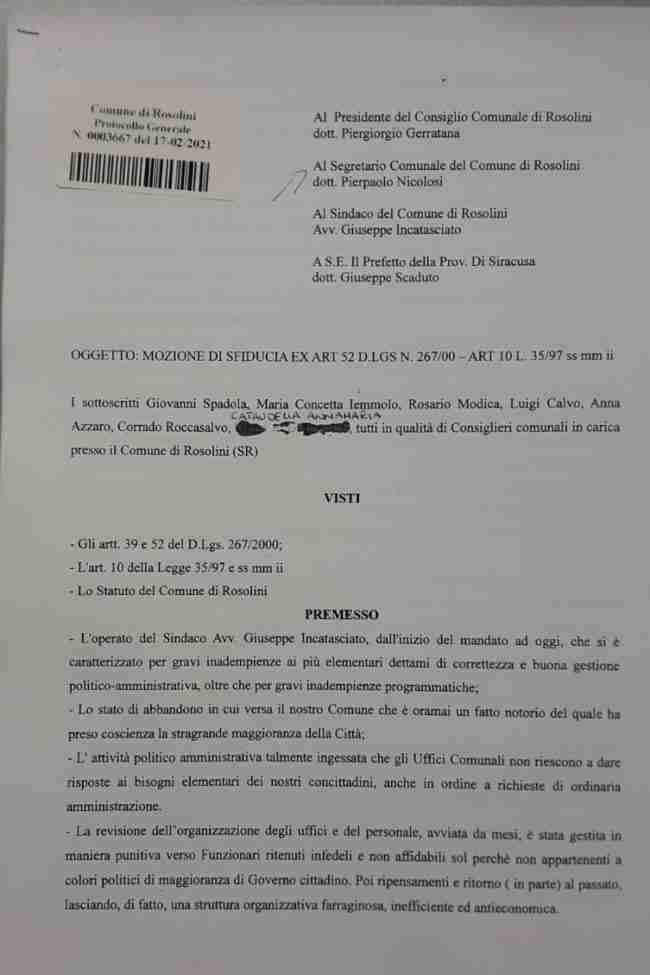 - La mozione di sfiducia presentata stamattina con il numero di protocollo