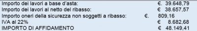 La ditta ha offerto, si legge nella determina, “il ribasso sull’importo dei lavori a base di gara del 2,50% e quindi per un importo contrattuale di € 48.149, 41 così ripartiti:”