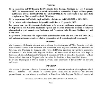 Rosolini zona arancione, il sindaco chiude tutte le scuole, riattivata la Dad dal 10 al 19 gennaio