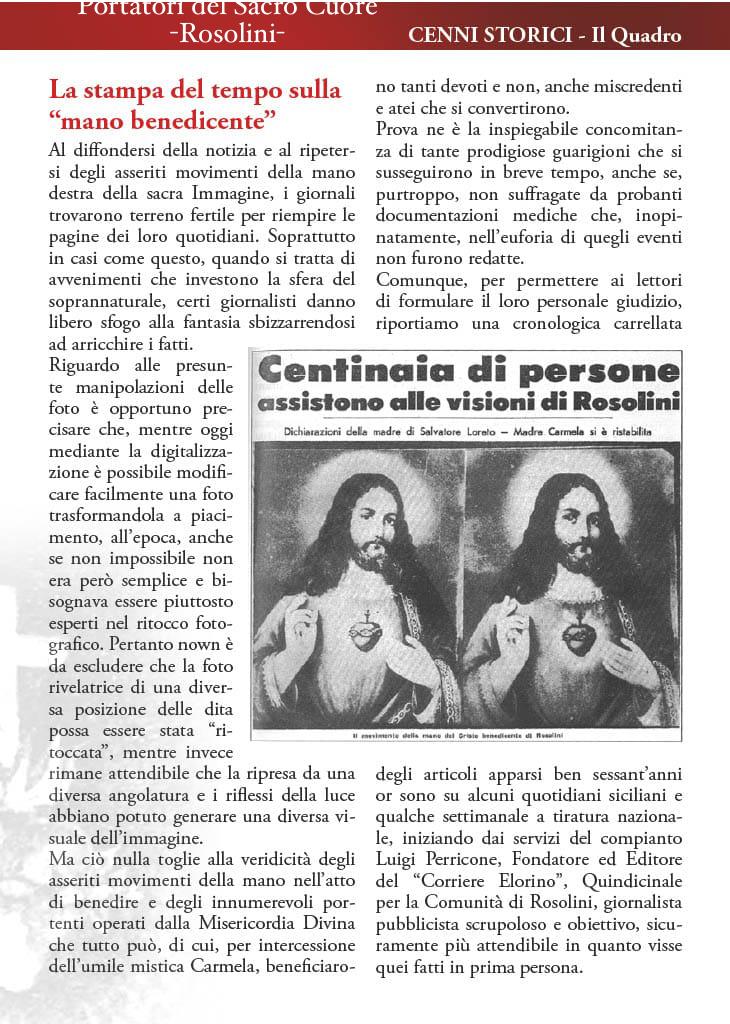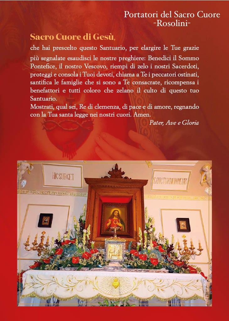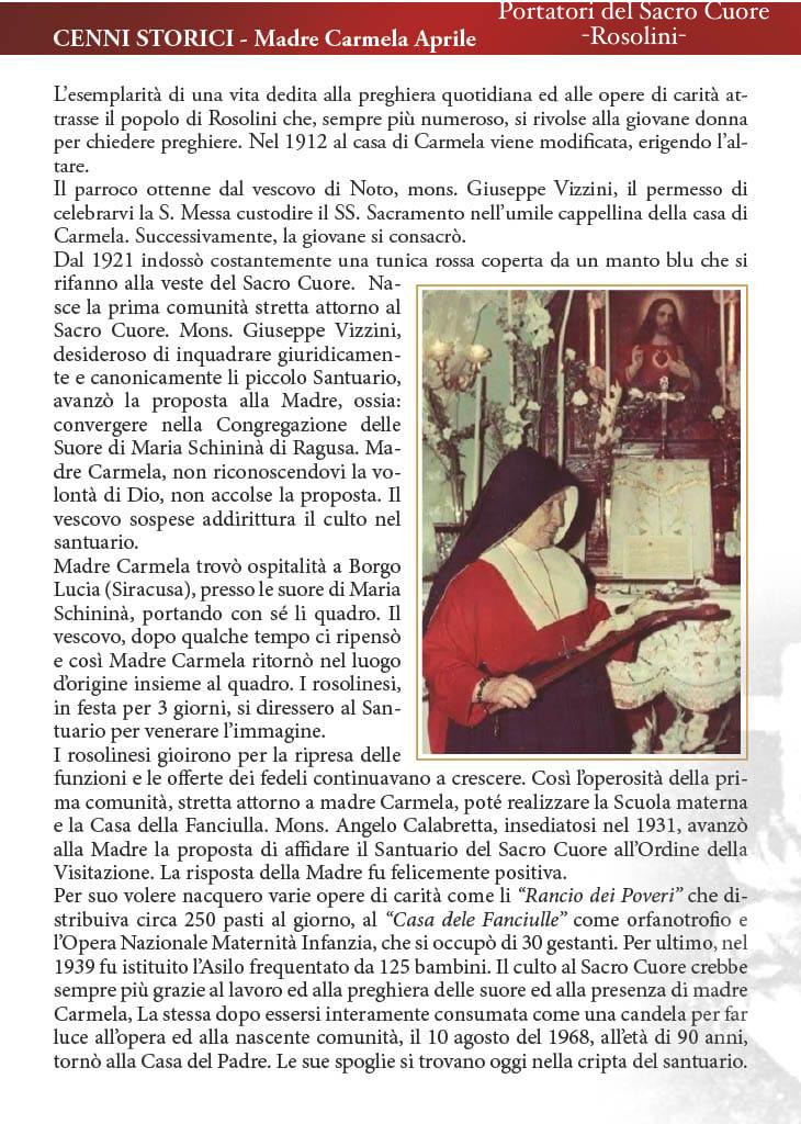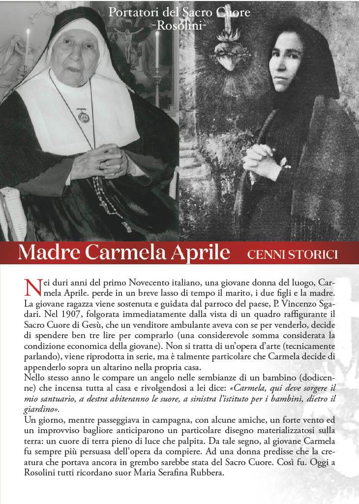 La storia di questa devozione affonda le radici nei primi anni del Novecento, quando la giovane Carmela Aprile, colpita da gravi lutti familiari, trovò consolazione e ispirazione in un quadro del Sacro Cuore di Gesù, acquistato per tre lire nel 1907. Quell’immagine, sebbene non un’opera d’arte tecnica, divenne il fulcro di un’esperienza mistica che portò alla visione di un angelo che le indicò la costruzione di un santuario, con le suore a destra, l’istituto per bambini a sinistra e un giardino dietro. La sua vita dedita alla preghiera e alla carità attirò il popolo di Rosolini, e la sua umile casa divenne il luogo dove, dal 1912, si celebrò la Santa Messa e si custodì il Santissimo Sacramento. Anche dopo una sospensione del culto, il quadro tornò con Madre Carmela, accolto con tre giorni di festa dai rosolinesi. Oggi le sue spoglie riposano nella cripta del santuario, testimoniando un’eredità di fede e opere caritatevoli come il “Rancio dei Poveri” e la “Casa delle Fanciulle”. Il Santuario del Sacro Cuore continua ad essere un faro di grazia, dove i devoti si rivolgono al Re di clemenza, di pace e di amore.