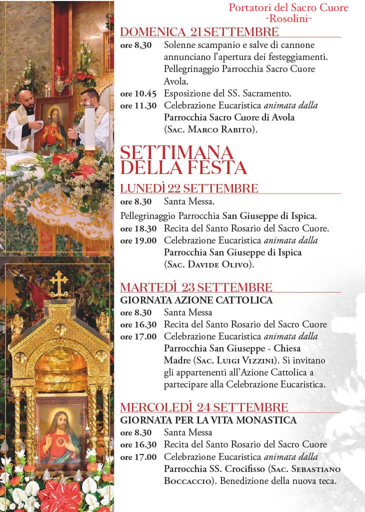 Le celebrazioni avranno inizio domenica 21 settembre con il solenne scampanio e salve di cannone, che annunceranno l’apertura dei festeggiamenti. La giornata vedrà il pellegrinaggio della Parrocchia Sacro Cuore di Avola, con l’esposizione del Santissimo Sacramento e la Celebrazione Eucaristica animata dal Sac. Marco Rabito.