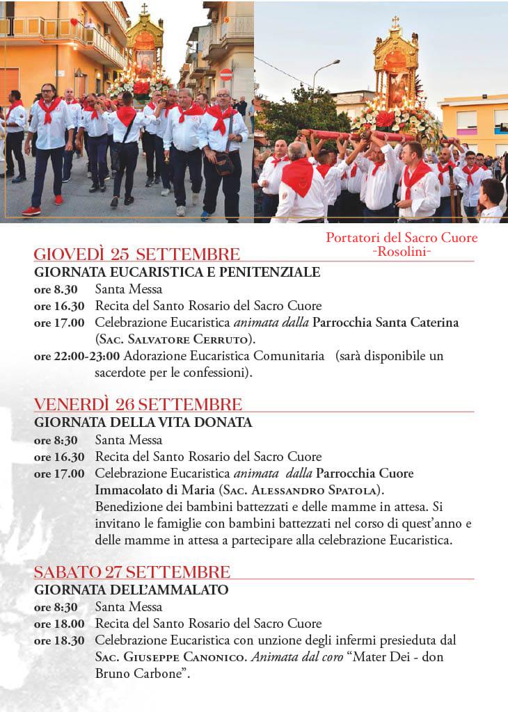 • Giovedì 25 settembre sarà la “Giornata Eucaristica e Penitenziale”, animata dalla Parrocchia Santa Caterina (Sac. Salvatore Cerruto), e si concluderà con un’Adorazione Eucaristica Comunitaria e la disponibilità per le confessioni.