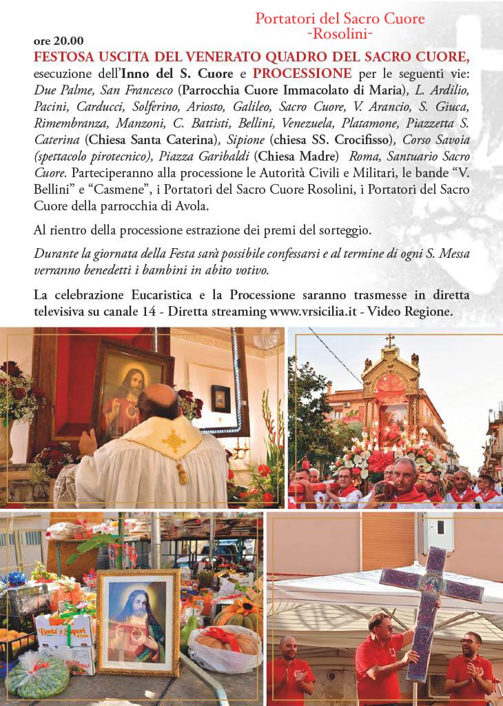 Il culmine delle celebrazioni sarà alle ore 20 con la FESTOSA USCITA DEL VENERATO QUADRO DEL SACRO CUORE, seguita dall’esecuzione dell’Inno del S. Cuore e dalla solenne PROCESSIONE che si snoderà per le vie principali della città. Il percorso toccherà numerose parrocchie e chiese, tra cui la Parrocchia Cuore Immacolato di Maria, la Chiesa Santa Caterina e la Chiesa SS. Crocifisso, concludendosi con il rientro al Santuario Sacro Cuore dopo il passaggio per Piazza Garibaldi (Chiesa Madre). Alla processione parteciperanno le Autorità Civili e Militari, le bande e i Portatori del Sacro Cuore di Rosolini. Al rientro, avverrà l’estrazione dei premi del sorteggio. Per tutta la giornata della Festa sarà possibile confessarsi, e al termine di ogni Santa Messa verranno benedetti i bambini in abito votivo. La celebrazione Eucaristica e la Processione saranno trasmesse in diretta televisiva su canale 14 e in streaming su www.vrsicilia.it – Video Regione.