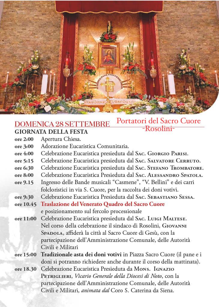 La giornata culminante sarà la domenica 28 settembre, che si aprirà alle 2:00 con l’apertura della Chiesa e proseguirà con Adorazioni Eucaristiche e diverse Celebrazioni Eucaristiche fin dalle prime ore del mattino. Alle 9:15, l’ingresso delle bande musicali “Casmene” e “V. Bellini” e dei carri folcloristici in via S. Cuore darà il via alla raccolta dei doni votivi.