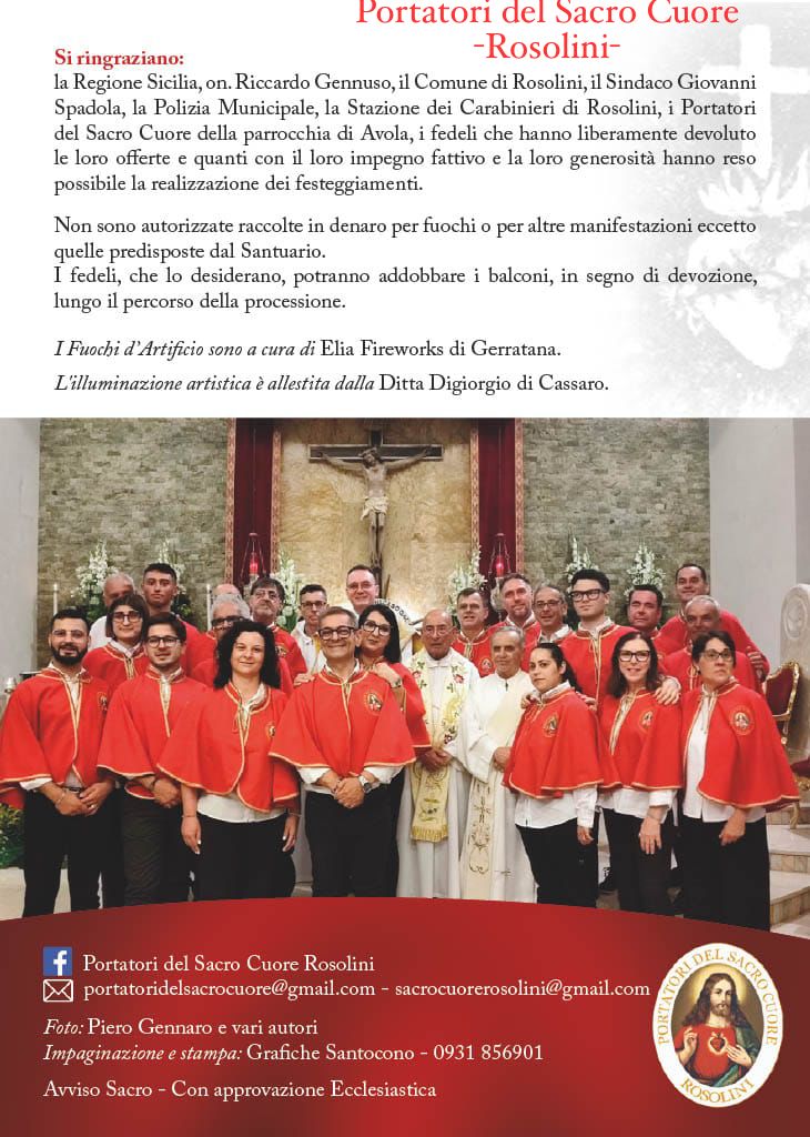 I festeggiamenti sono resi possibili grazie al contributo della Regione Sicilia, del Comune di Rosolini, del Sindaco Giovanni Spadola, della Polizia Municipale, della Stazione dei Carabinieri di Rosolini, dei Portatori del Sacro Cuore della Santuario della Visitazione di Rosolini, dei fedeli e di quanti con il loro impegno e generosità hanno contribuito alla realizzazione. I fuochi d’artificio sono a cura di Elia Fireworks, e l’illuminazione artistica è allestita dalla Ditta Digiorgio di Cassaro. Si invitano i fedeli ad addobbare i propri balconi lungo il percorso della processione in segno di devozione.